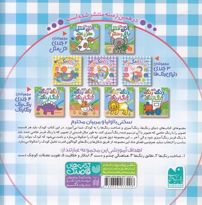 کتاب دنیای رنگ ها(3) : مجموعه ی کتاب های دنیای رنگ ها، رنگ آمیزی و شناخت رنگ ها را به کودک شما می آموزد. در این کتاب کودک باید هر قسمت تصویر را با رنگ خاصی که تصویر با آن ترسیم شده رنگ آمیزی کند. به طور مثال قسمتی از تصویر که با رنگ قرمز نقاشی شده، باید با رنگ قرمز رنگ آمیزی شود و الی آخر... اهداف این کتاب عبارتند از : 1- شناخت رنگ ها، 2- تطابق رنگها، 3- هماهنگی چشم و دست، 4- ابتکار و خلاقیت، 5- تقویت عضلات کوچک دست و...