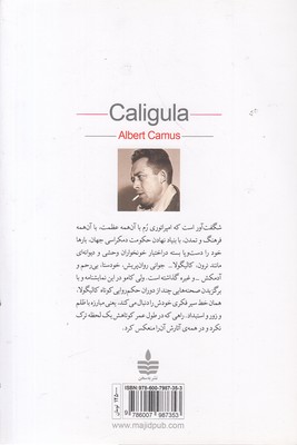 کتاب کالیگولا : کالیگولا، امپراتور دیوانه و خونخوار رُم در سال 12میلادی به دنیا آمد. از سال37 تا 41 میلادی سلطنت کرد و به دست یکی از همراهانش به نام کِرِآس در سن 29 سالگی کشته شد. بسیاری از کسان و نزدیکان خود را به بهانههای پوچ کُشت. کامو این نمایشنامه را در سالهای جنگ نوشت و کالیگولا را به عنوان شخصیت اصلی نمایشنامهاش به این دلیل انتخاب کرده تا به طور غیرمستقیم نشان دهد چگونه ملتی با تمدنی بالا و داشتن کسانی مانند گوته، شیلر، بتهوون، افسارش را به دست سرجوخهی حقیر، پرعقده و خونخواری مانند هیتلر سپرد تا دنیا را به خاک و خون بکشد، جان میلیونها آدم بیگناه را بگیرد و آن همه ویرانی به بار بیاورد که دودش تا حد زیادی به چشم خود ملت آلمان هم رفت. کامو در هر سه نمایشنامهاش: دادگسترها، کالیگولا و حکومت نظامی، اشارهاش به همین موضوع است، یعنی وقتی ملتی اختیار جان و مال و کشورش را به دست یک نفر میسپارد، که البته آن فرد هم به زور و با ایجاد رعب و وحشت و خفقان قدرت را به دست میگیرد، چه نتایجی به بار میآورد و..