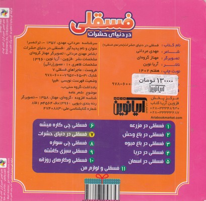 کتاب ماجراهای فسقلی 7-در دنیای حشرات : بخشی از کتاب- فسقلی یه شب تو خواب- خیلی ریزه میزه شد- فسقلی تر از خودش-کوچولو قد نخود- یه دفعه یک حلزون- رد شد از کنار اون- گفت سلام فسقلی جون- کمی پیش من بمون- من خونه م رو دوشمه- هم کوچیکه هم قشنگ- مهمون من شو بیا- بچه ی زبر و زرنگ و...