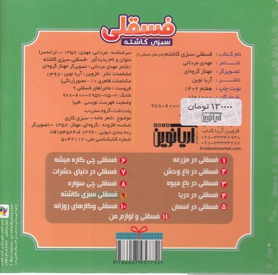 کتاب ماجراهای فسقلی 9-سبزی کاشته : بخشی از کتاب- یه روز توی مزرعه- فسقلی مهربون- شدش یه پا کشاورز- تا کار کنه فراوون- اول رسید به کلم- گفت شما خیلی نازی- اگر یه توپ گردی- بیا بریم به بازی- کلم بهش جواب داد- من کلمم که شادم- که جام توی ترشیه- یا که توی سالادم- گوجه به فسقلی گفت- من گوجه ای آبدارم و...