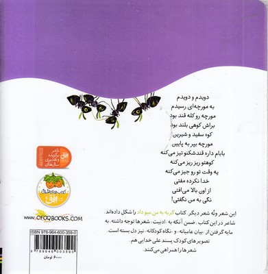 کتاب گربه به من میو داد (اتل متل ترانه شعر های کودکانه) : بخشی از کتاب-دویدم و دویدم-به یک اتو رسیدم- گفتم: چه دم درازی! - می آی من و تو بازی؟- اتو دمش رو تاب داد- با ناز به من جواب داد:- خطر داره بازی با من- نشو تو همبازی با من- تنم همیشه داغه- یه چشم دارم چراغه- پیف می کنم پاف می کنم- پیرهنتو صاف می کنم و...
